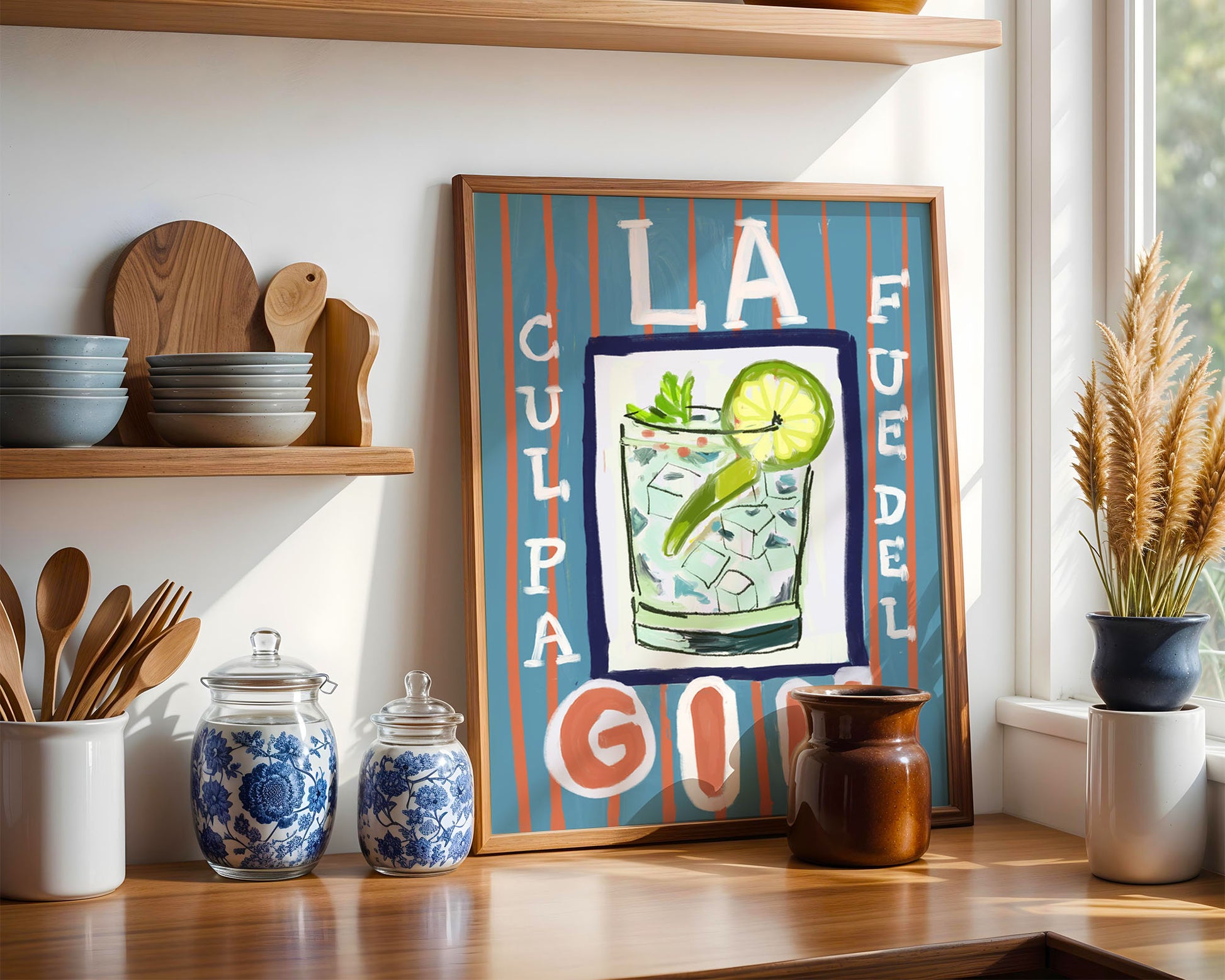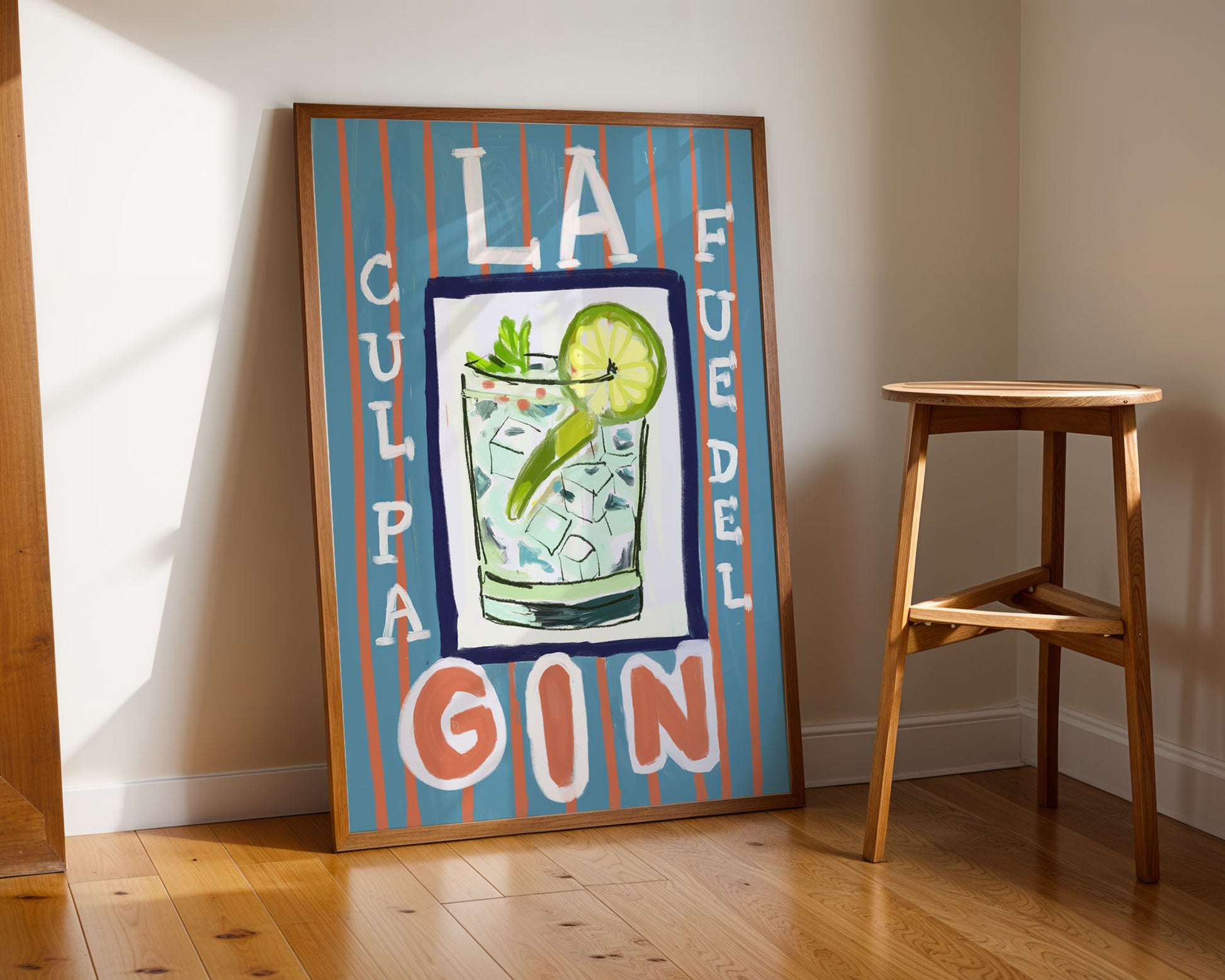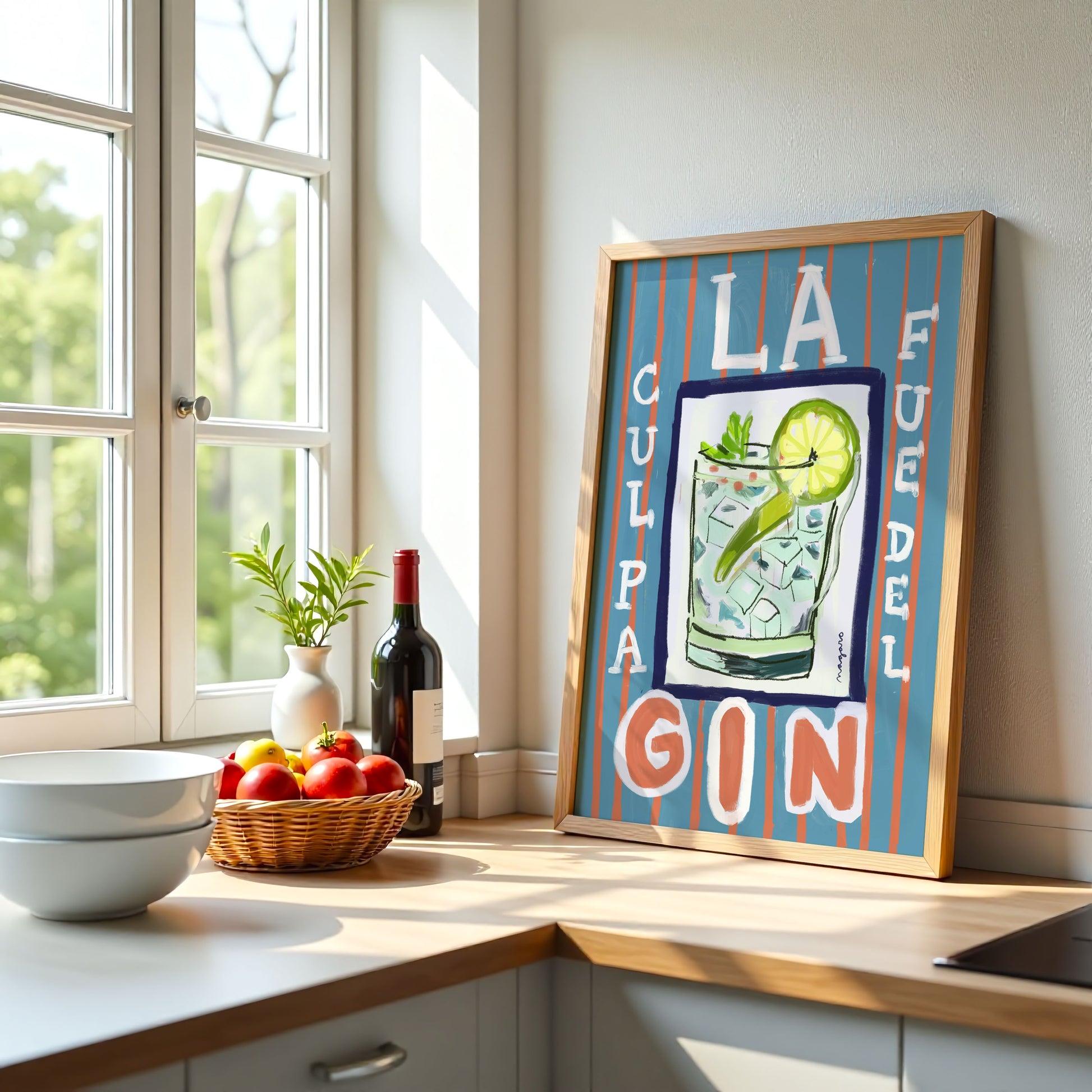 Esa copa que empezó inocente… y acabó en anécdota. Ilustración divertida y con aire retro para quienes saben que las mejores historias siempre tienen un toque de ginebra.