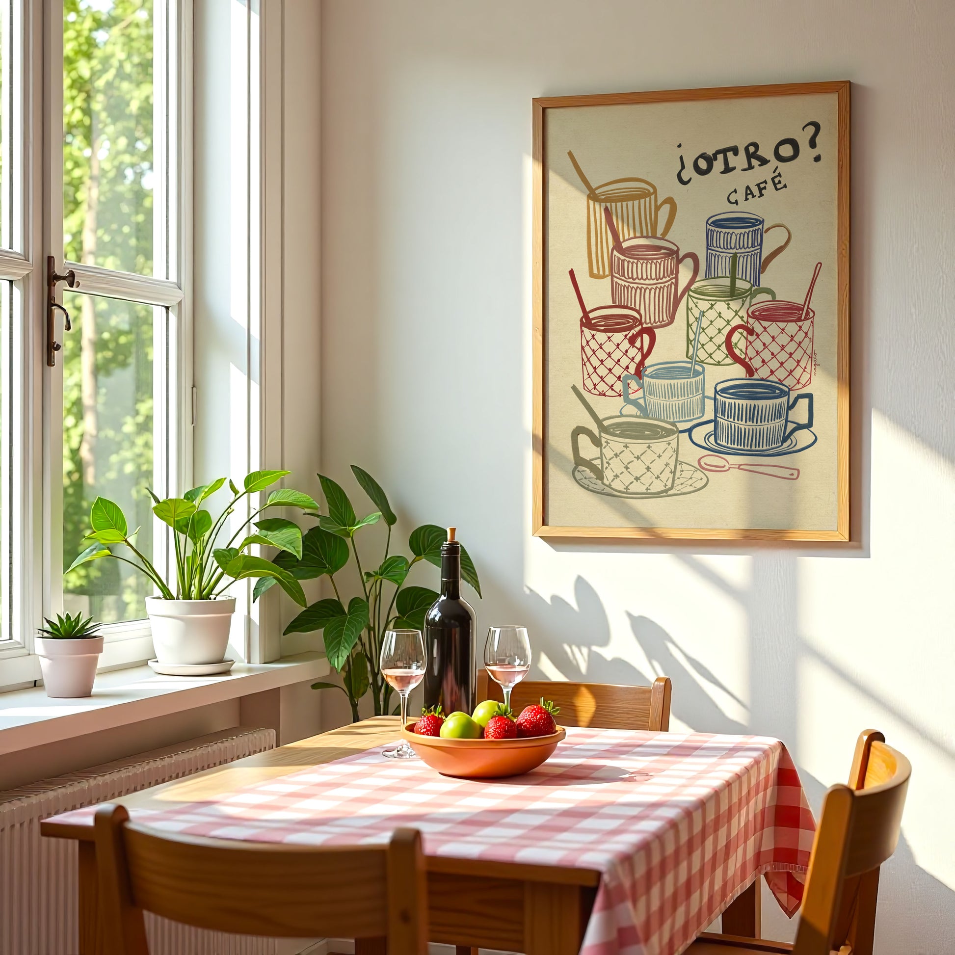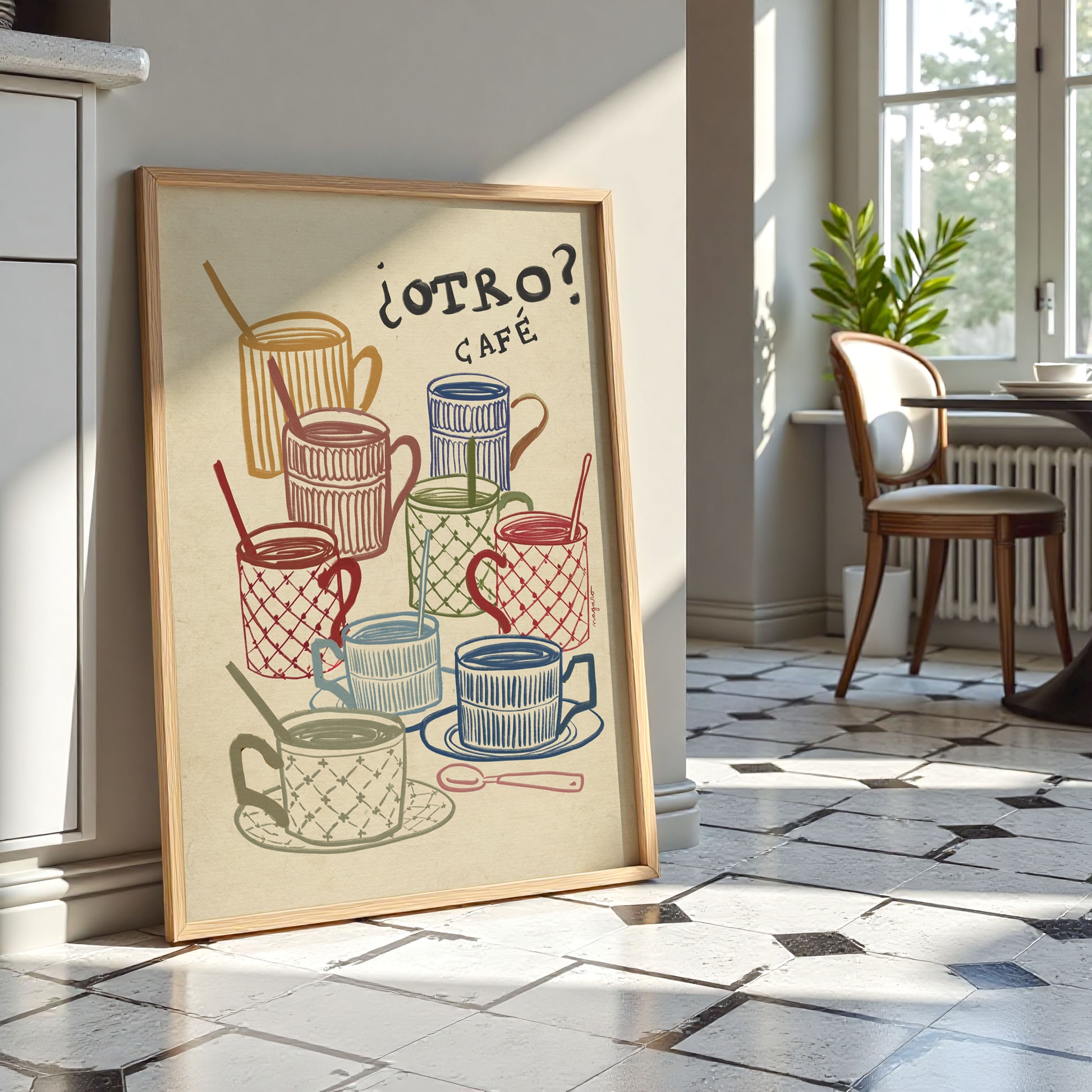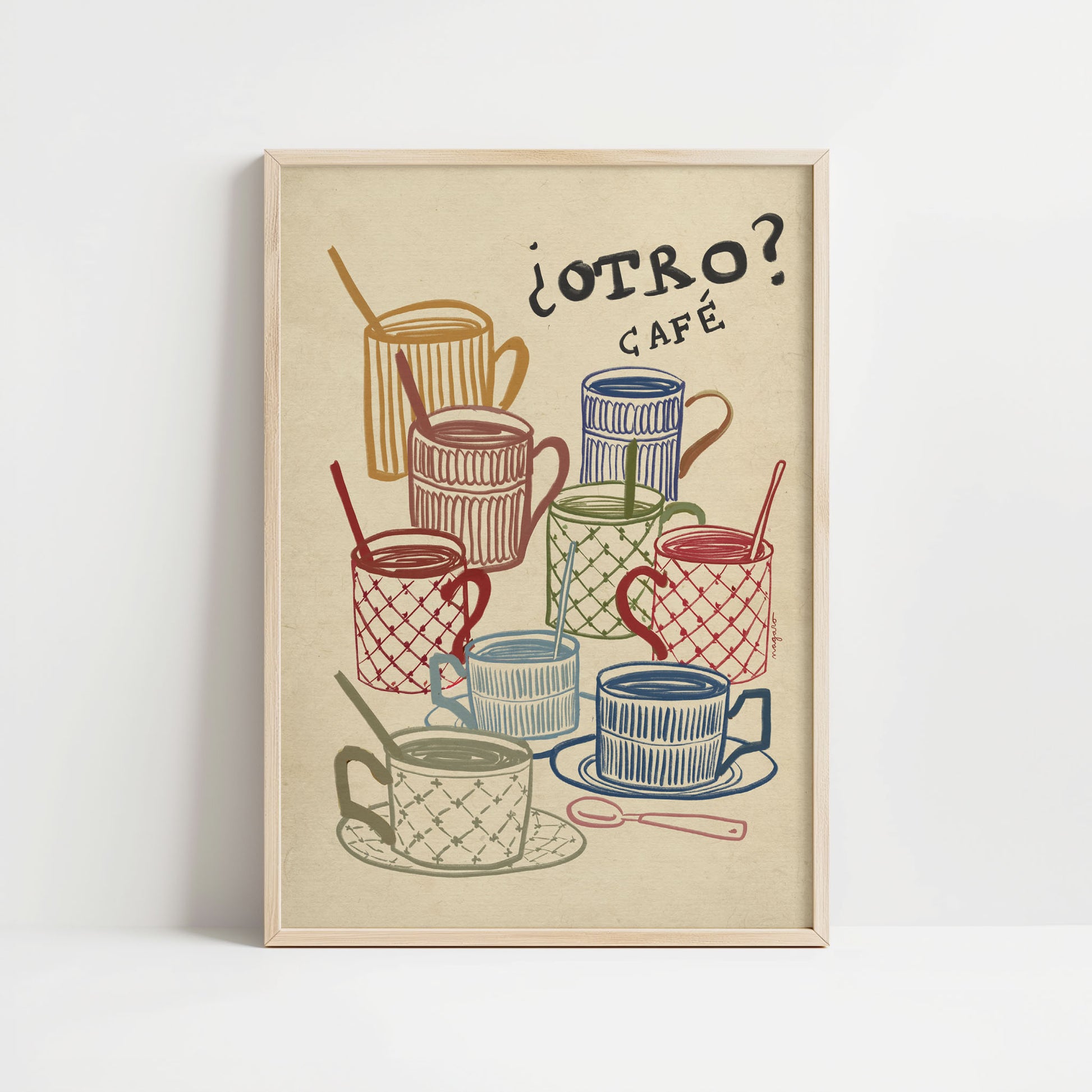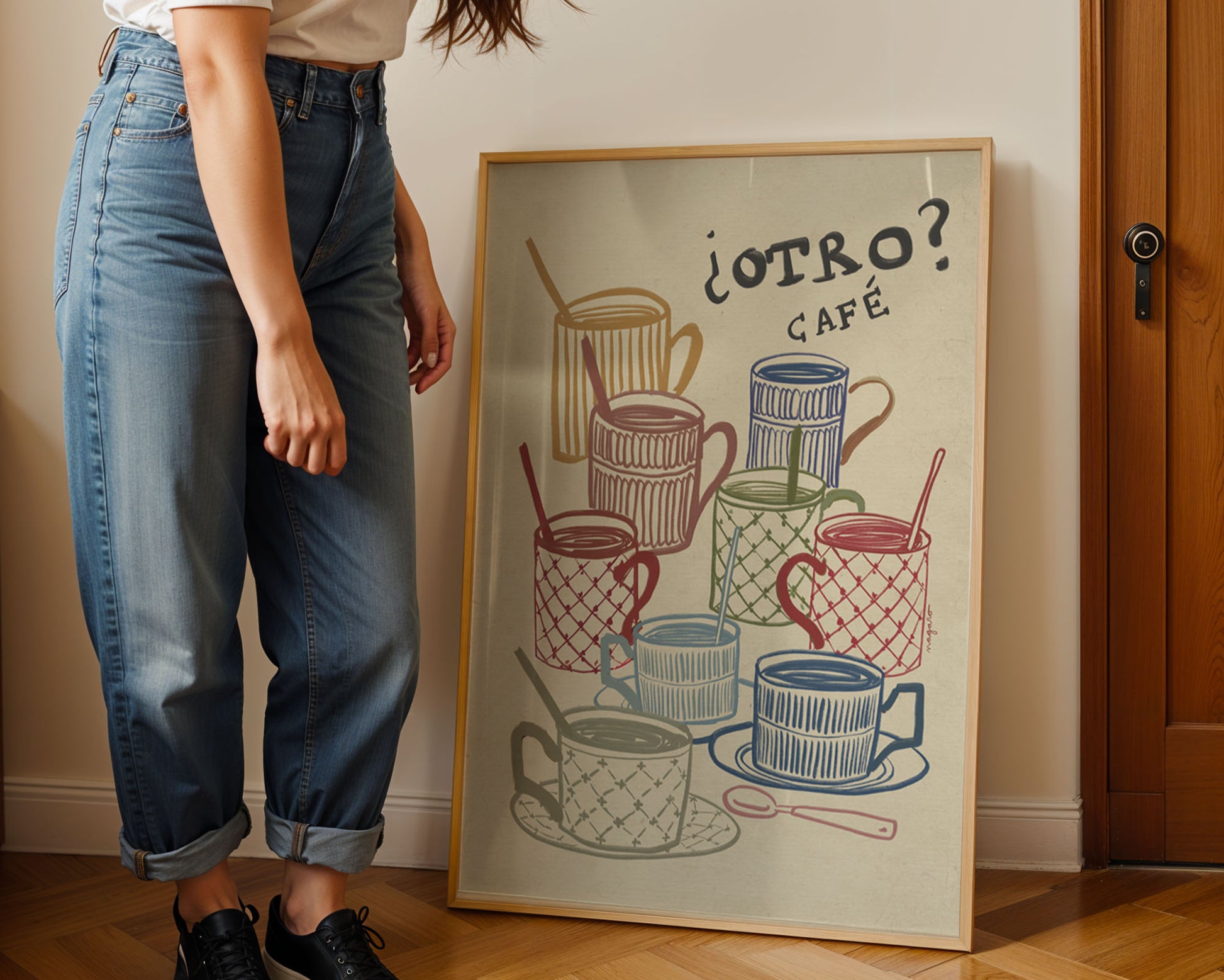 Para los que siempre dicen “el último” y nunca cumplen. Esta ilustración con tazas coloridas celebra el ritual más querido de muchos: el café eterno.