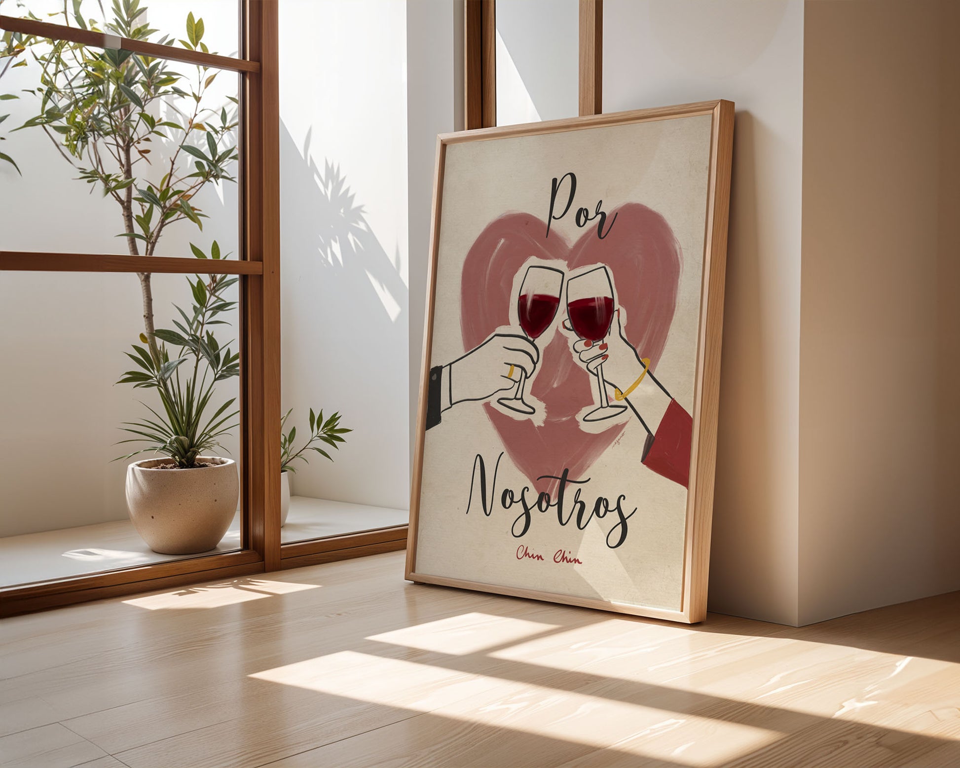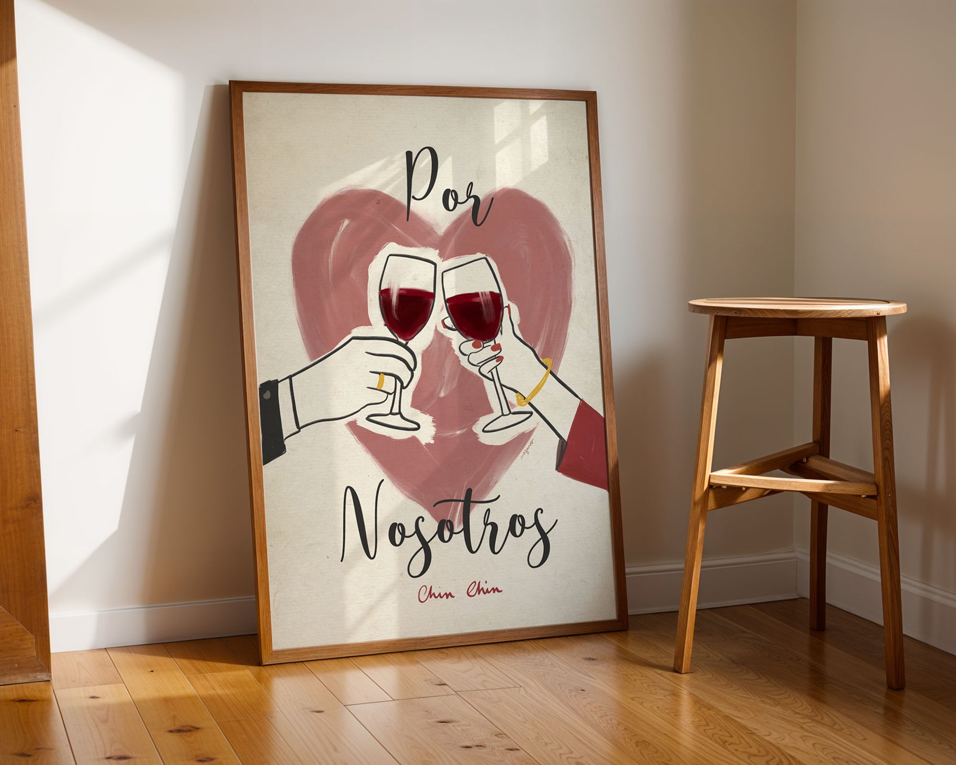 Un brindis por los momentos compartidos. Esta lámina captura el amor en estado puro: dos copas, dos manos, un corazón. Perfecta para celebrar aniversarios, bodas o simplemente el día a día con tu persona favorita.