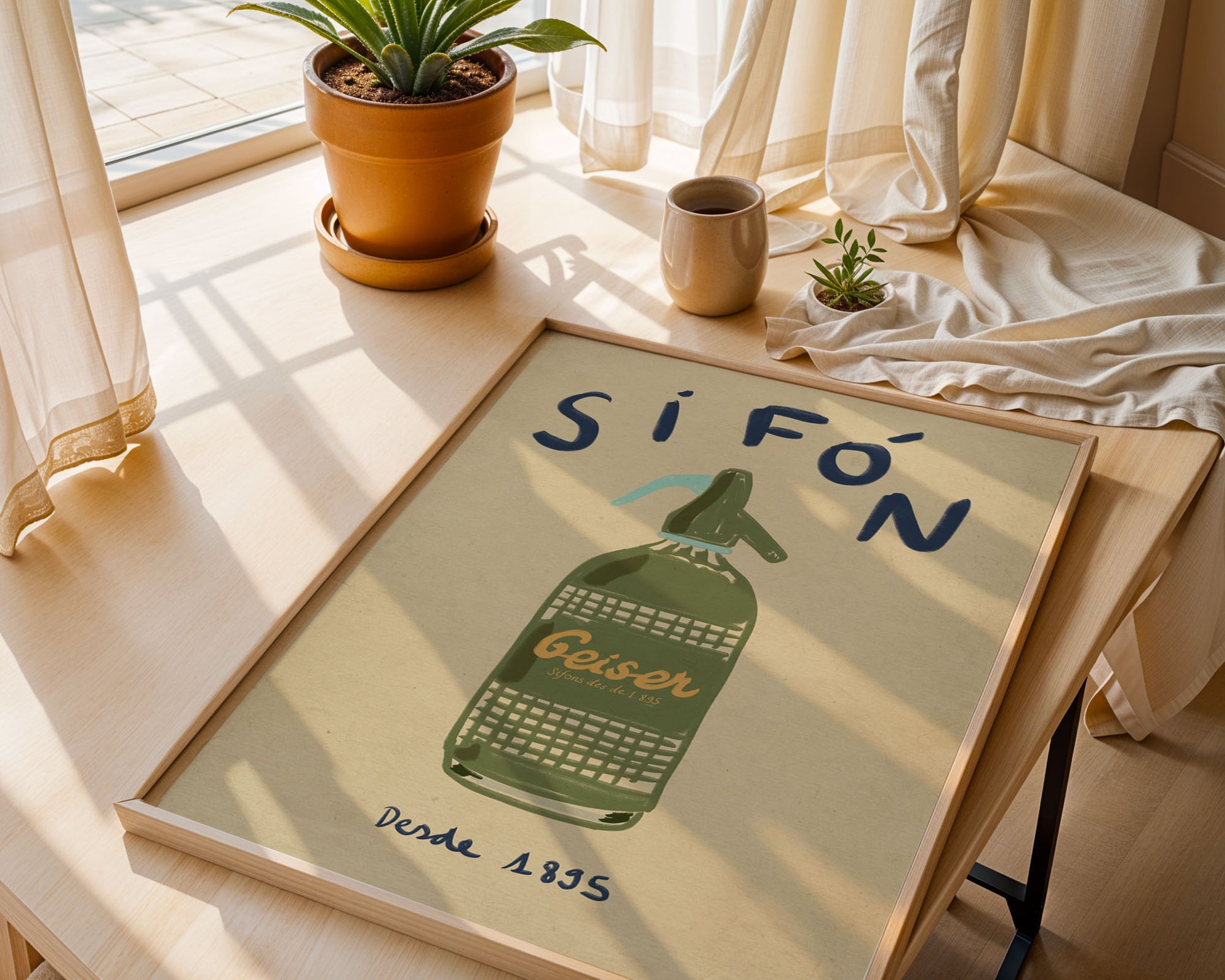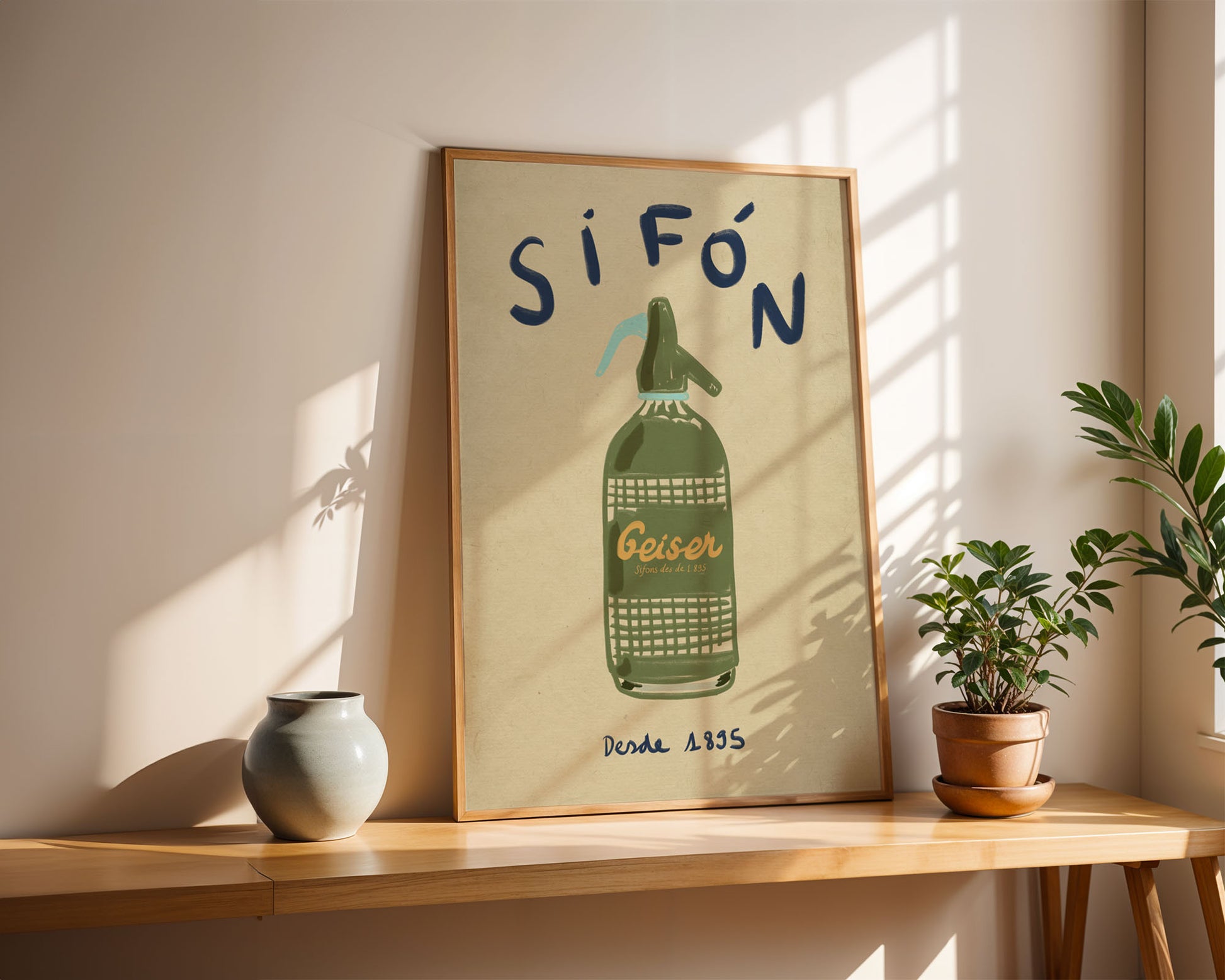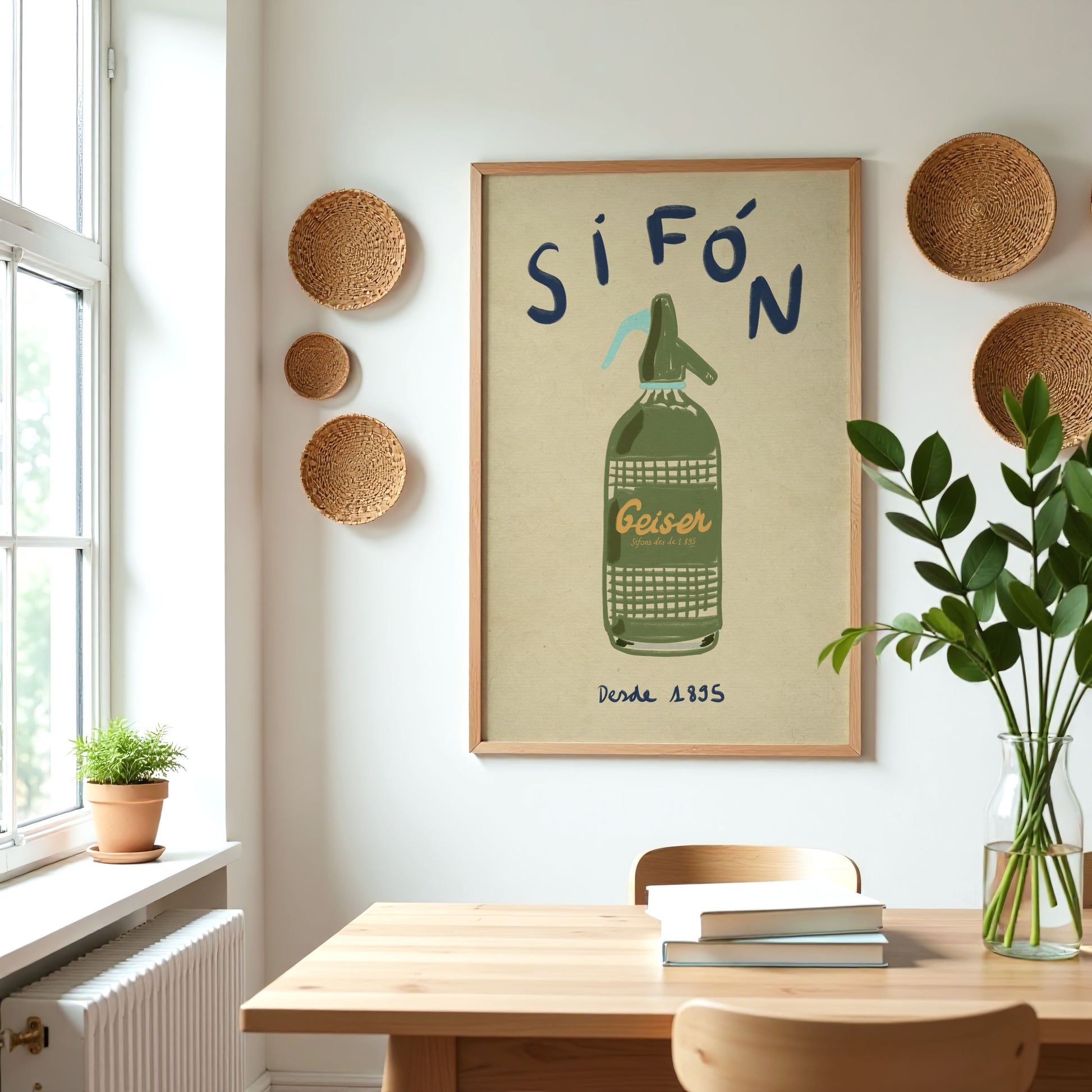 Un guiño nostálgico a los bares de antes. Esta lámina con ilustración de sifón es ideal para cocinas, salones o rincones con espíritu castizo.